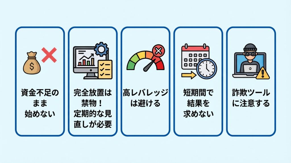 「自動売買で大損した」という話の多くは、以下のポイントを知らないまま始めてしまったケースです。事前に理解しておけば避けられるリスクばかりですので、しっかり確認しておきましょう。