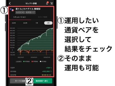 まずは無料で使えるシミュレーションで、いろいろな通貨ペアと戦略をチェックし、あなたにとって最適な運用スタイルを見つけましょう。